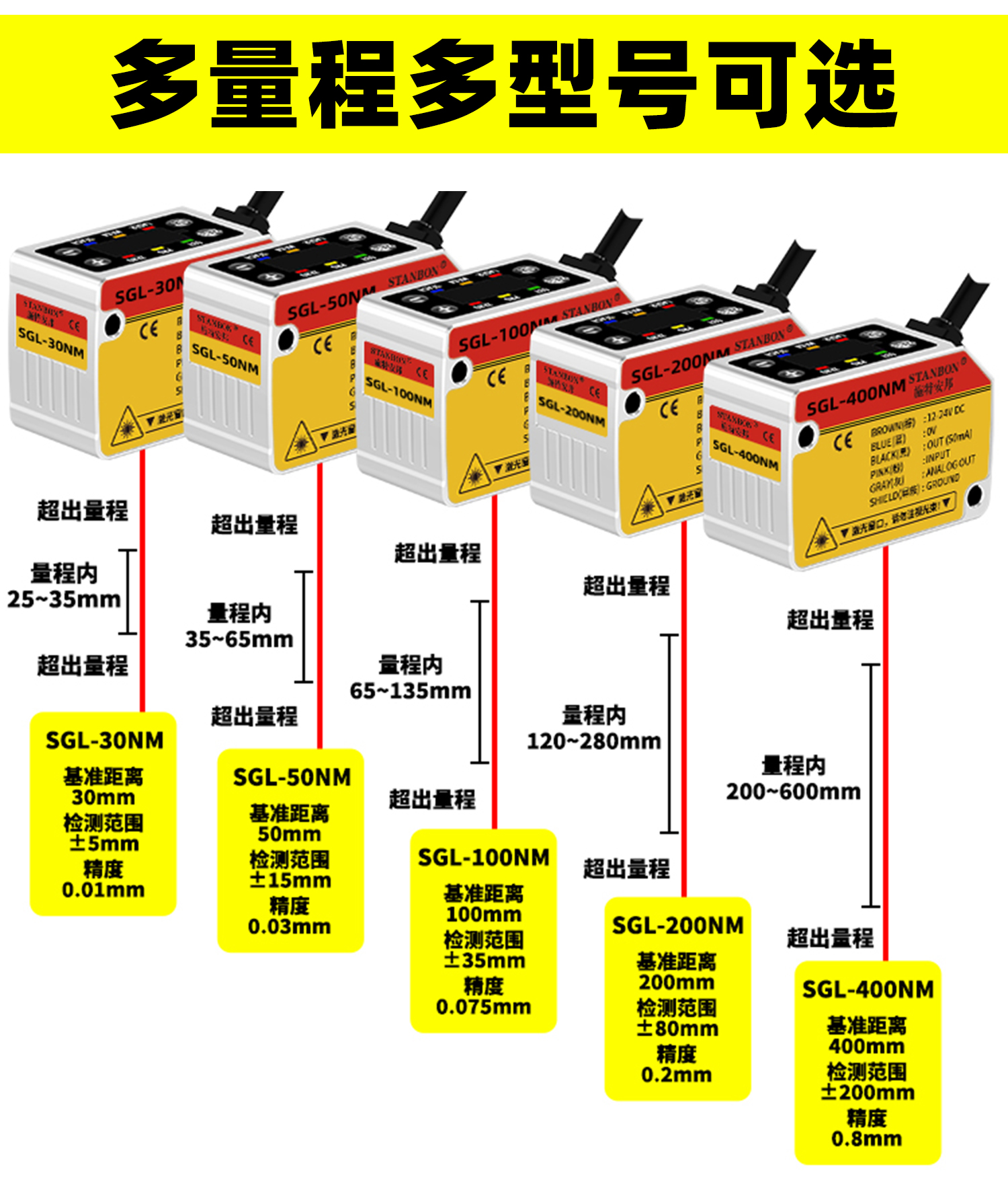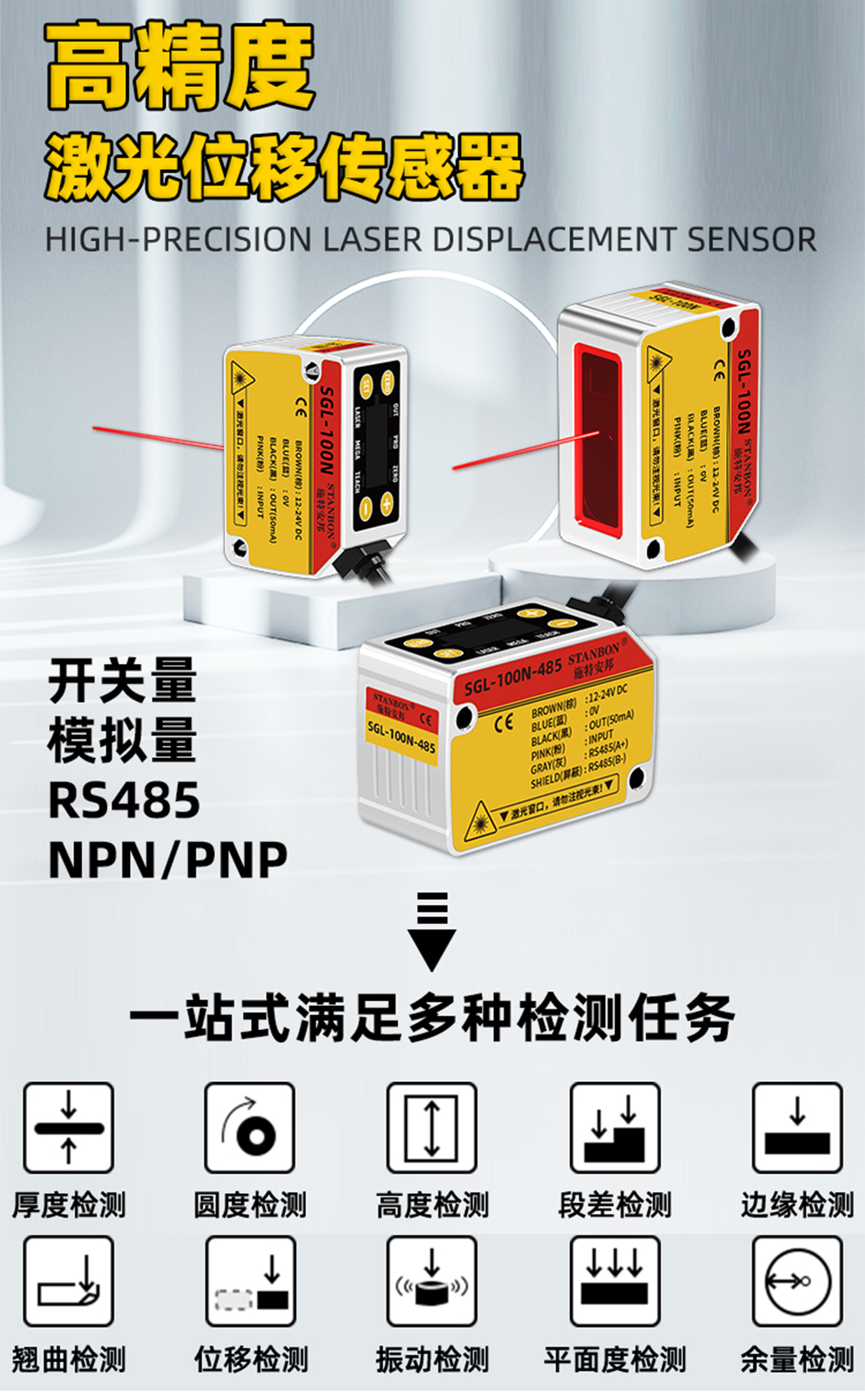 在工业4.0浪潮下,高精度、高稳定性的非接触式测量技术成为智能制造的核心需求。深圳市施特安邦科技有限公司凭借十余年传感器研发经验,推出全新SGL系列激光位移传感器,涵盖开关量、模拟量、数字量RS485三大输出型号,以卓越性能助力企业实现生产效率与产品质量的双重突破。下面我们一起来了解这款新产品: