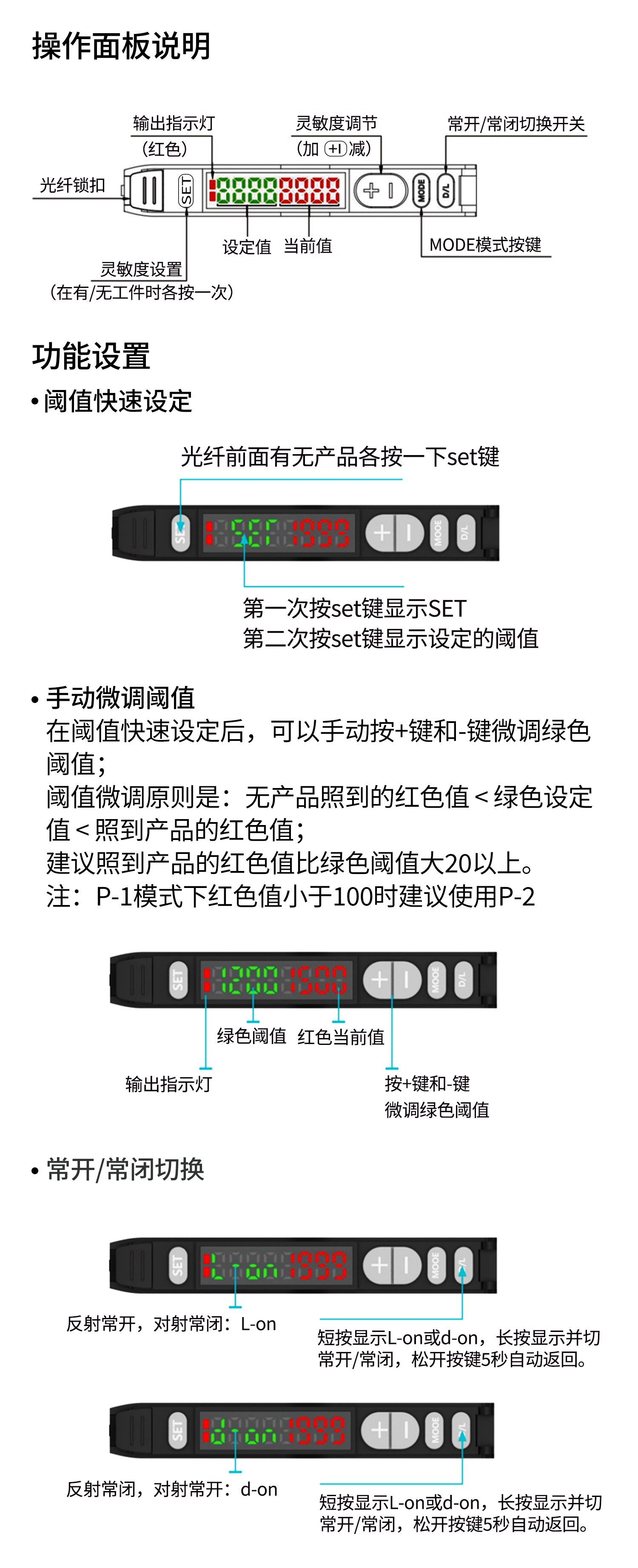 ST-18NH采用阈值快速设定+手动微调双模式,支持一键自动校准,并可通过“+”/“-”键精准微调绿色阈值,确保检测精度。例如,在高速流水线检测中,产品通过时的红色信号值需比绿色阈值高20以上,避免误判,保障生产连续性。