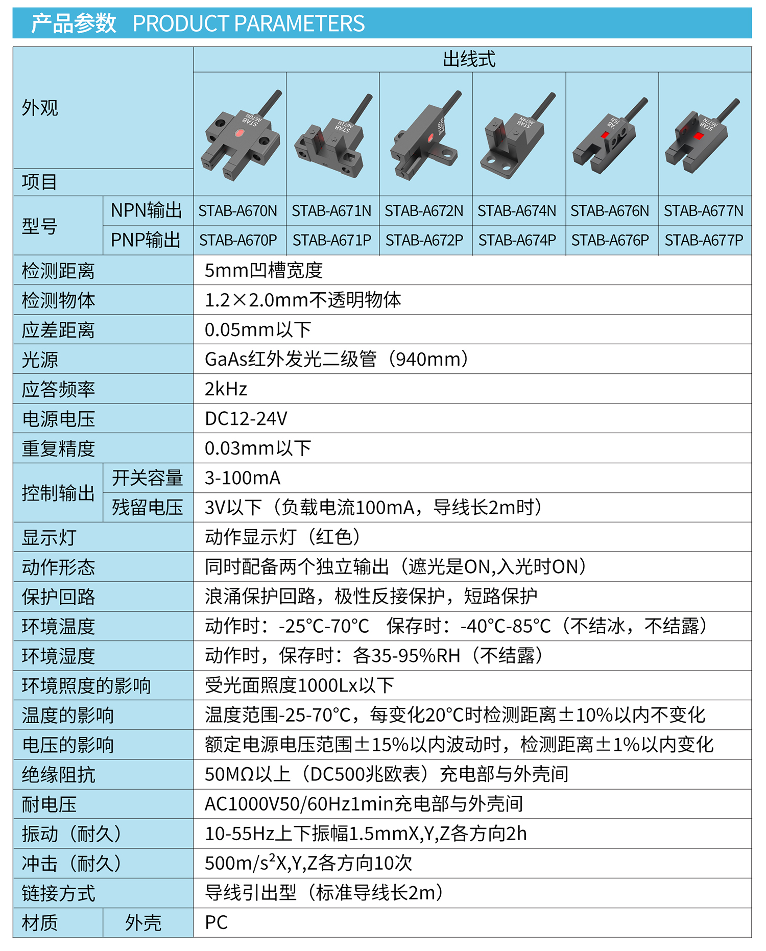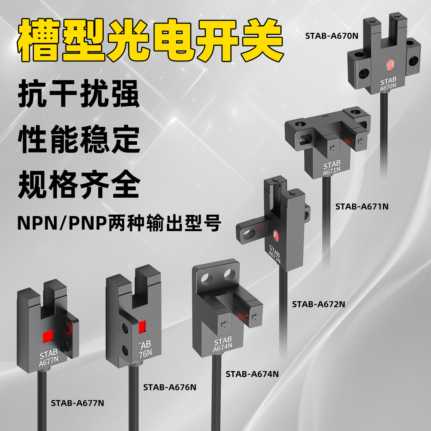 在工业自动化领域,精准、可靠的检测设备是保障生产效率的关键。施特安邦凭借多年光电传感技术研发经验,推出全新槽型光电开关系列,型号包括STAB-A670N、STAB-A671N、STAB-A672N、STAB-A674N、STAB-A676N、STAB-A677N,满足不同工业场景需求,为您的自动化设备提供稳定高效的检测方案!下面我们一起来详细了解这款系列产品: