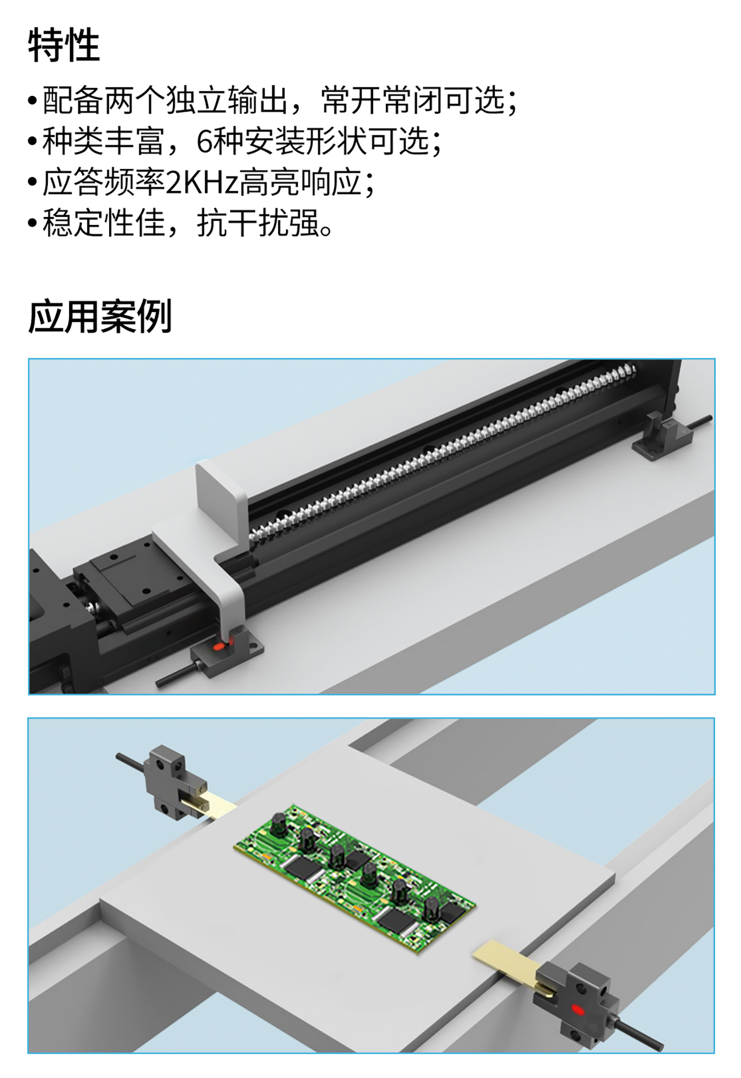 本系列提供6大型号,检测距离、响应速度、安装方式灵活可选,适配各类自动化设备,如包装机、印刷设备、流水线、电梯控制等。