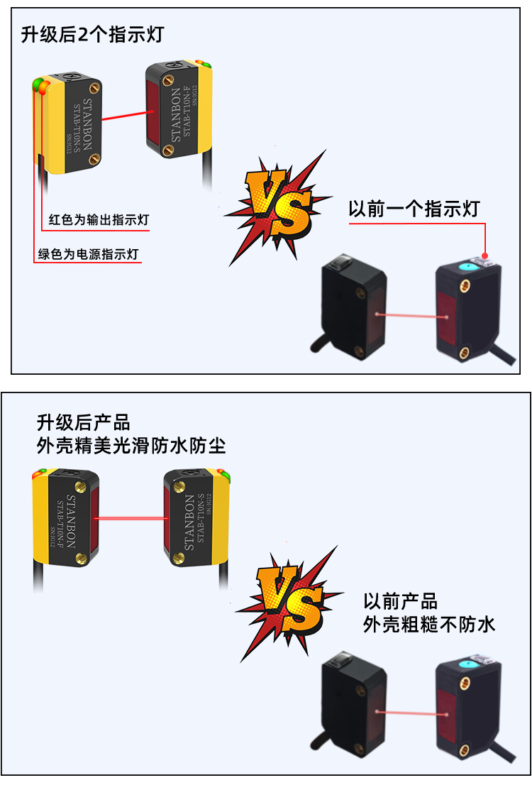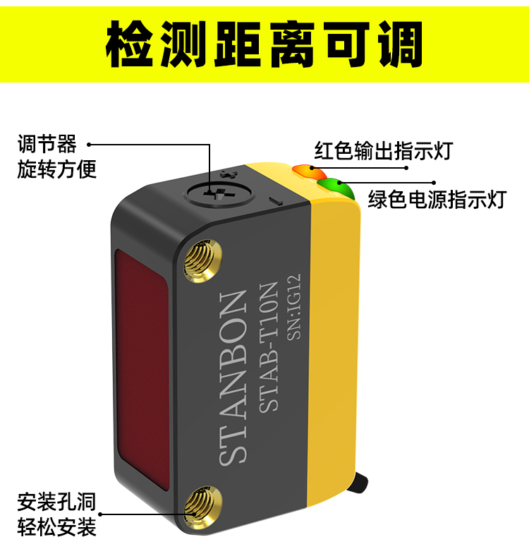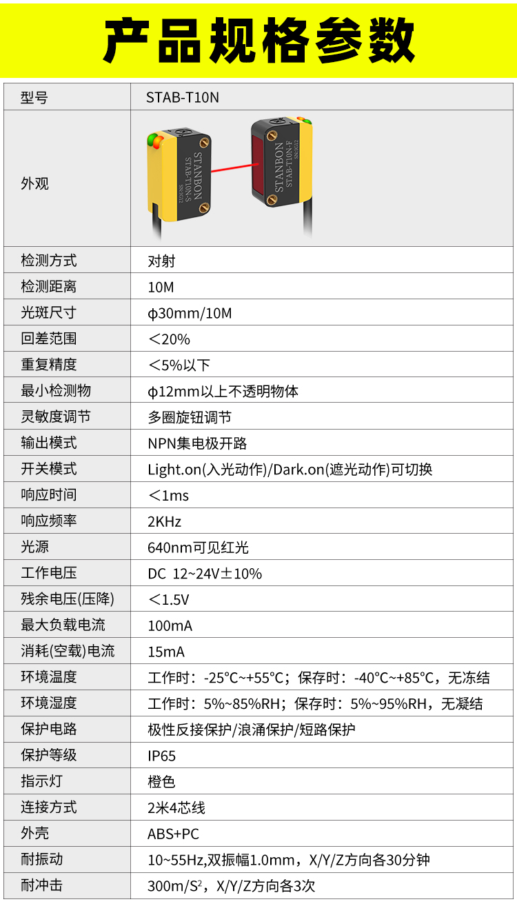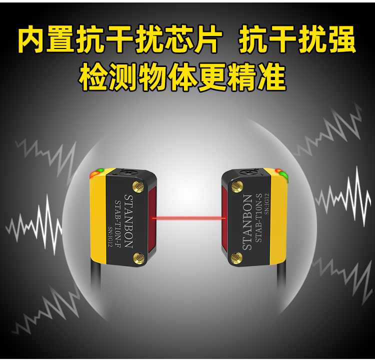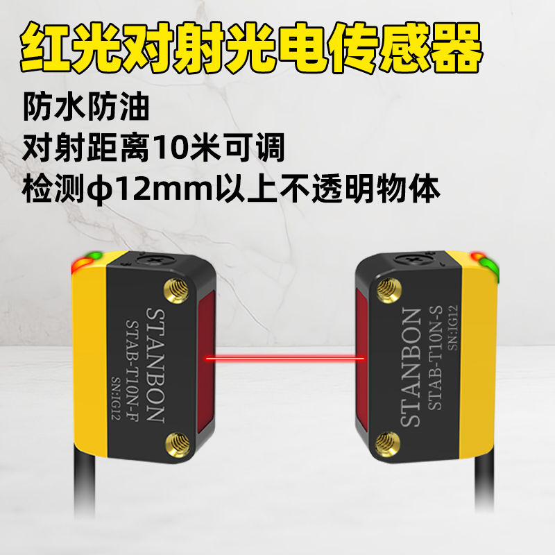 在智能制造与工业自动化浪潮中,精准可靠的物体检测技术是保障生产效率与安全的核心。深圳市施特安邦科技有限公司凭借14年行业深耕,正式推出STAB-T10N红光对射光电传感器——一款专为复杂工业场景设计的“抗干扰专家”,以10米可调对射距离、高精度检测重新定义工业传感器的性能边界。下面详细了解这款产品: