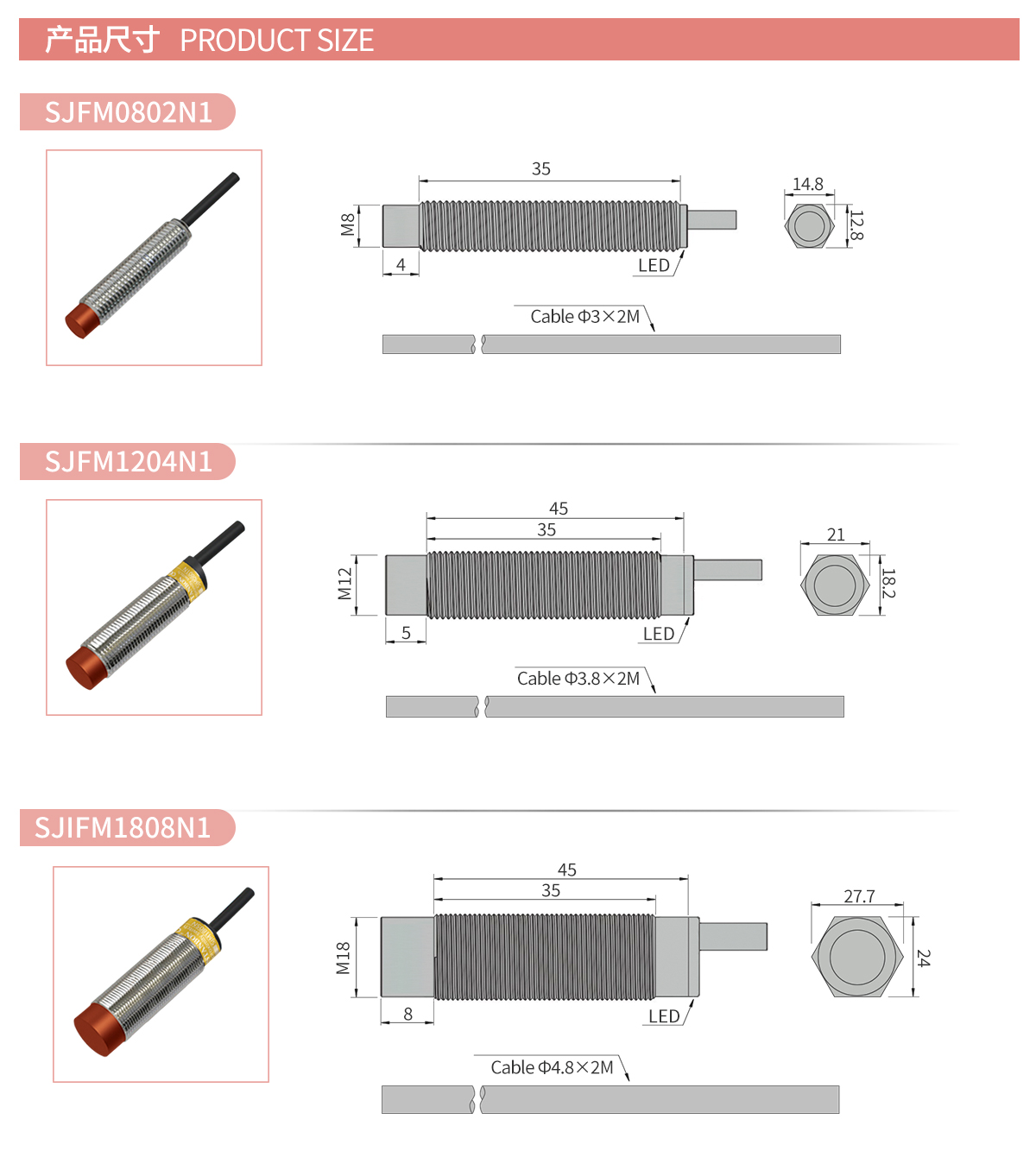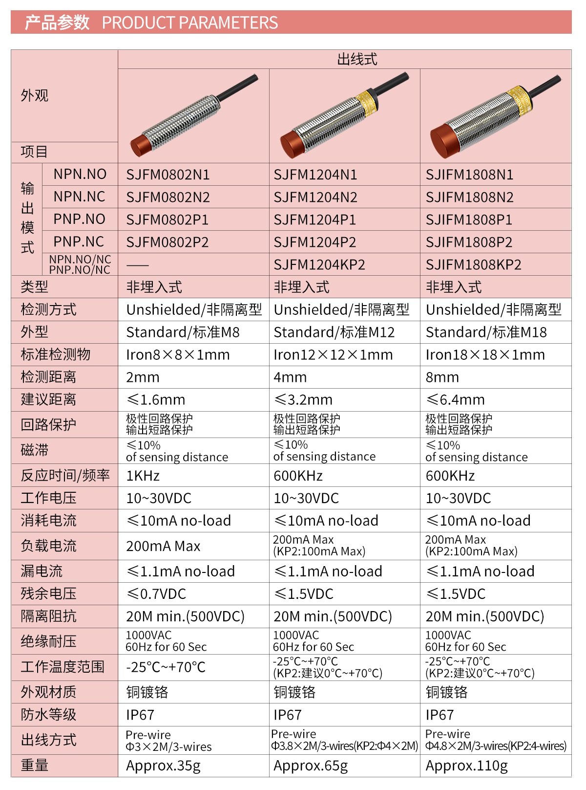三种主流规格,满足从紧凑空间到大范围检测的差异化需求。非磁性金属检测距离可达2mm(Φ8mm型号),响应频率高达500Hz,适用于高速流水线精准定位