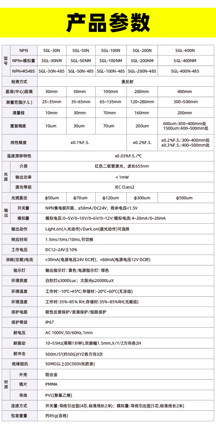 在智能制造浪潮席卷全球的今天,激光位移传感器作为工业测量的“神经末梢”,正以非接触、高精度、抗干扰的核心优势,重新定义精密制造与智能检测的边界。深圳市施特安邦科技有限公司凭借十余年光电传感技术积淀,推出全新一代激光位移传感器系列——SGL开关量系列、NPN+RS485系列、NPN+模拟量系列,满足工业场景全维度需求,为半导体、汽车制造、3C电子、物流自动化等领域提供“毫米级到千米级”的精准测量解决方案。下面我们详细了解: